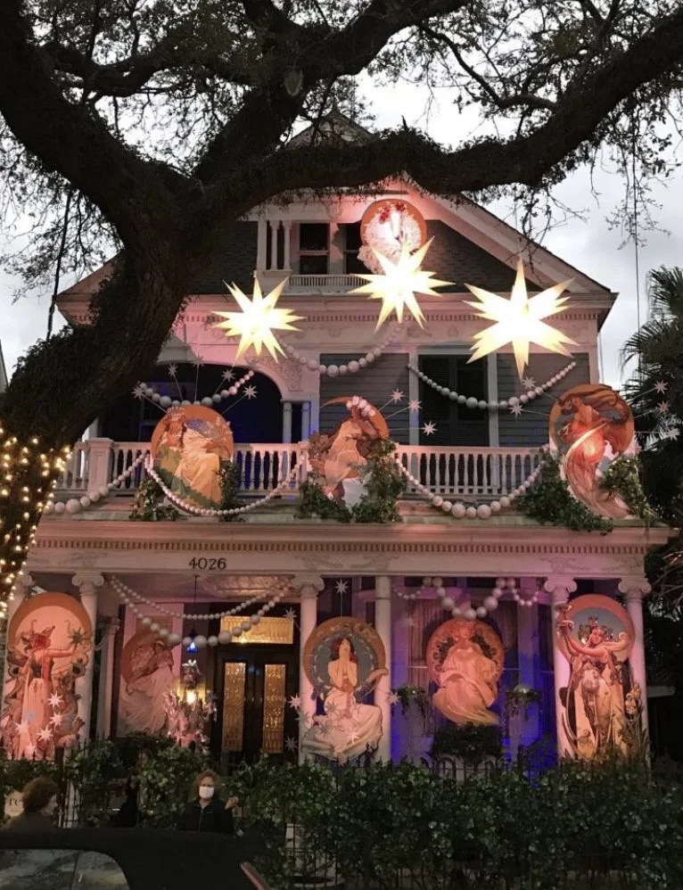 This installation was designed by Susan Gisleson & Kellie Talbot as an act of artistry in lieu of a parade, during COVID years. The design sought to evoke the cosmos in times of chaos and employed customized motifs of Alphonse Mucha’s work in conjunction with found objects to do just that. I was honored to be a part of this as a technical assistant, and hung the second-floor pieces at 4026 St. Charles Ave.