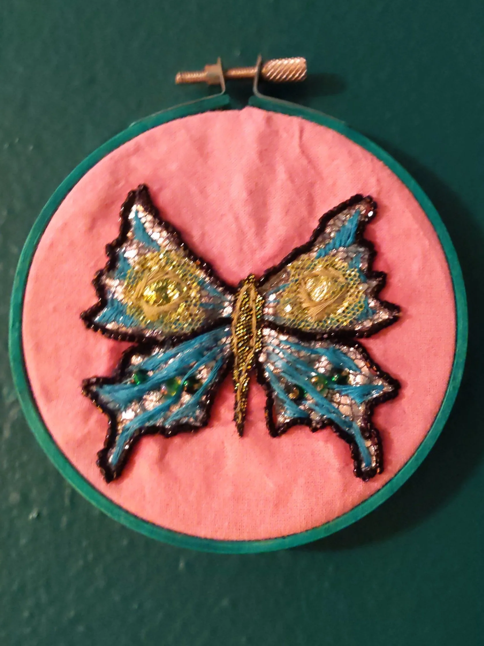 A fun little embroidery of laid work from a Robert Crum reference. 2023.